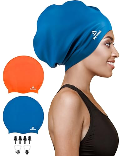 2-pack extra stor badmössa för flätor och dreadlocks, silikonbadmössor för långt hår, väv, förlängningar, lockar och afros, vattentäta badmössor för vuxna badmössor för kvinnor män (orange + marinblå)