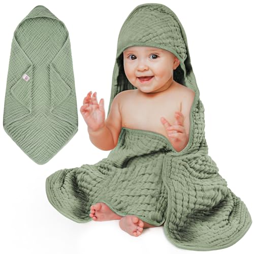 Aolso Babyhanddukar med huva, 80 × 80 cm babyhandduk, huva för badrum, crepe bomull badponcho barn mjuk och superabsorberande, babyhandduk med huva unisex, bubbelsand grön