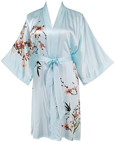 Ledamon Kimono för kvinnor, kort badrock av 100% siden, Ljusblå – a, one size