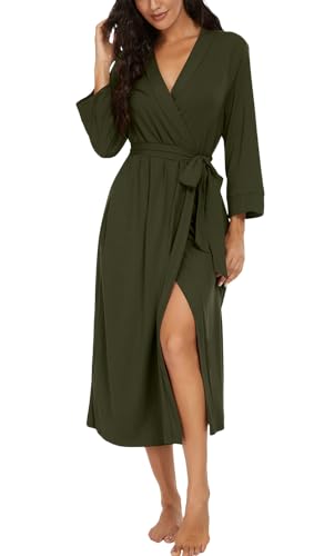 PrinStory kvinnor lång/kort badrock stickad kimono morgonrock mjuka dammorgonrockar avslappnade damer myskläder, AA10 olivgrön, XL