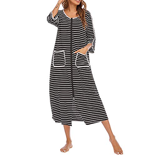 Huazong Morgonrockar för kvinnor, med dragkedja, kort-/långärmad, mjuk badrock med fickor, nattkläder, sovkläder, svart, storlek L