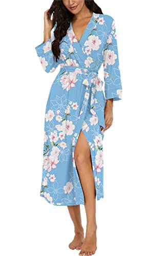 PrinStory kvinnor lång/kort badrock stickad kimono morgonrock mjuka dammorgonrockar avslappnade damer myskläder, BB05 Blommig Ljusblå, XXL