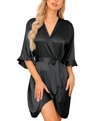 Wikoan Badrock för kvinnor, satinmorgonrock, kimono, morgonrock, kort satinbadrock med bälte, V-ringad, kimono, badrockar, svart, M