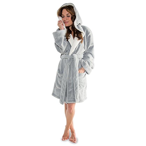 CelinaTex Miami badrock, huvad, tvåtonad, kort, lappade fickor, kvinnor, mikrofiber, korallfleece S Grey Cream White