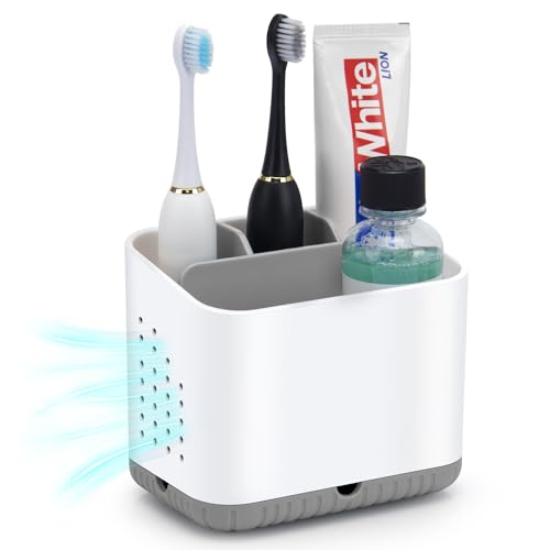 Toothbrush Holder, i grått, med elektrisk tandborsthållare och stort avlopp, halkfri plastgolv, lämplig för badrum och familjer (18 × 12 × 9,8 cm)
