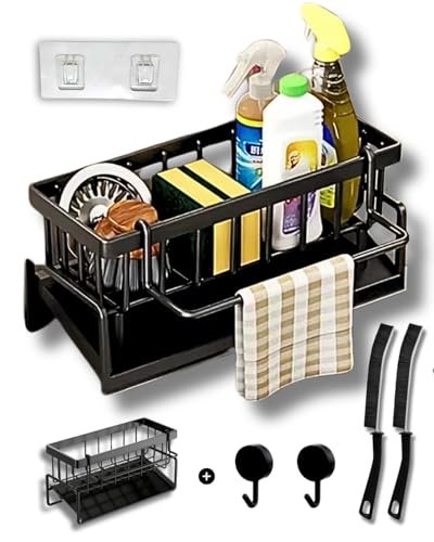 ZANDIA® ️ Köksarrangör svart diskbänk + väggsjälvhäftande hållare + 2 självhäftande hängare + 2 rengöringsborstar i köket | diskbänksarrangör med avlopp | svampstöd | badrum och kök