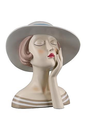 GILDE Dekorativ skulptur figur dam – med hatt röda läppar – dekoration badrum vardagsrum – höjd 32 cm – blå vit kräm