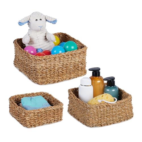 Relaxdays Förvaringskorg, uppsättning av 3, sjögräs, 3 storlekar, flätade, badrum, dekoration, fyrkantiga redskapskorgar, natur