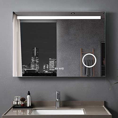 MEESALISA LED-badrumsspegel, 100 x 70 cm, med belysning, väggspegel för badrum, imfri ljusspegel med uttag, klocka, touch, dimbar