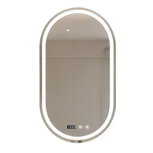 Badrumsspegel med Belysning. LED-Väggspegel Oval med 3 Färgtemperaturer, Dimbart och Anti-Dimma, med Klocka & Temperaturvisning. Perfekt för Badrum eller Skrivbord (Vertikal 60x90cm)