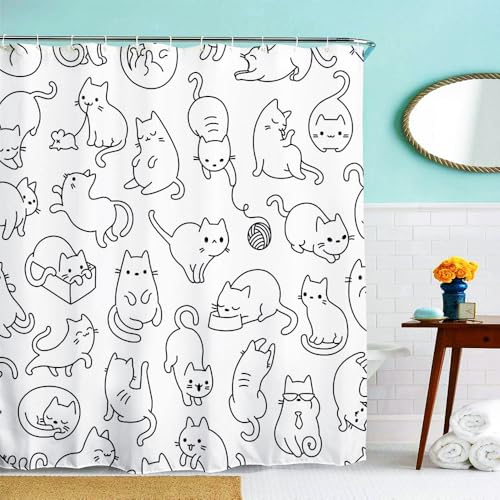 IcosaMro Duschdraperi för badrum med krokar, svart och vitt, sött kattunge-mönster och färgglada teckningar, rolig dekoration, långt tyg, 180 x 183 cm