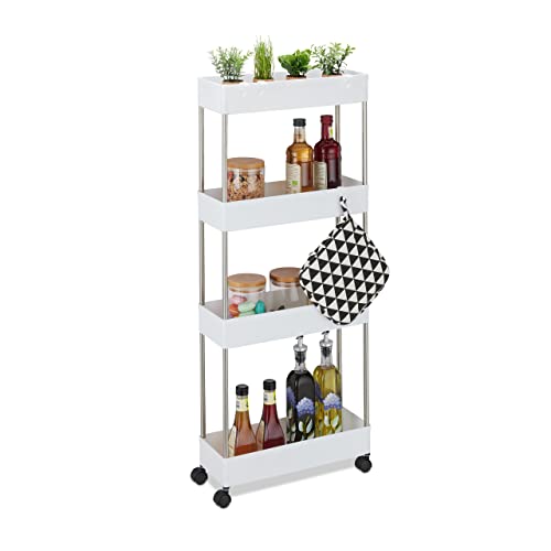 Relaxdays nischvagn, plast, HBT 98 x 15,5 x 40,5 cm, smal nischhylla badrum, kök, 4 krokar och fack, vit