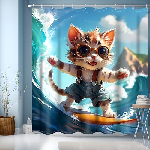 NEJLCTOROUS Rolig katt duschdraperi 180 x 200 cm, söt tecknad badkarsgardin, hav hav våg badgardin, polyester vattentäta badrumsgardiner för barn badrum med krokar