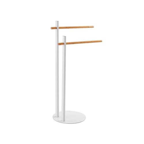 Piantana handdukstork för badrum - golvhanddukshållare för badrum med 2 krokar, i metall och bambu, 22 x 80,5 x 22 cm, vit och beige