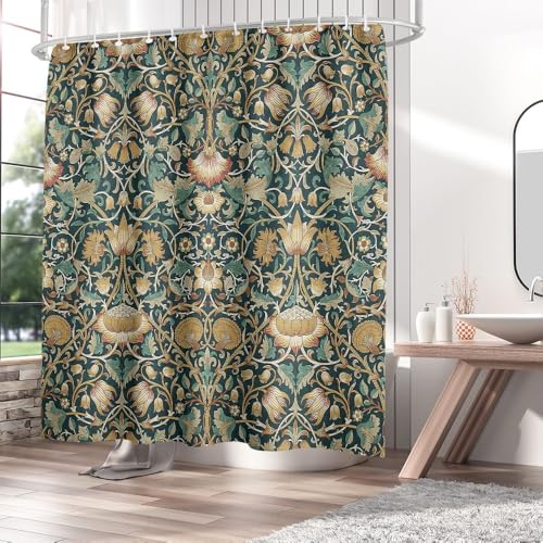 William Morris abstrakt växt blomma duschdraperi, vintage blommig, vår färgglada vilda blommor gröna örter boho växt natur, badrum duschdraperi med krokar 180 x 180 cm