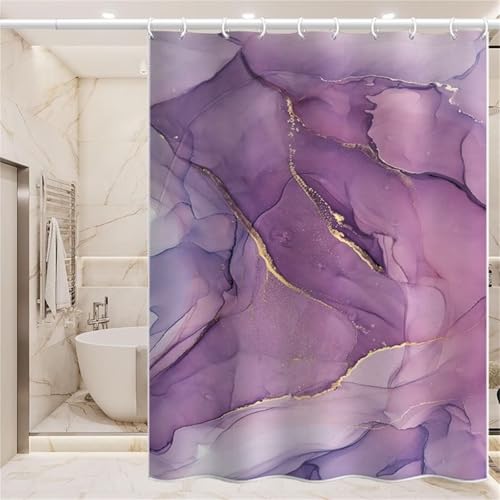 Vattentätt duschdraperi, lila marmor duschdraperi tillverkat av polyestertyg, tvättbart, viktad fåll, med 12 krokar, badrum för uteplats familj hotell, 300 x 180 cm A-106