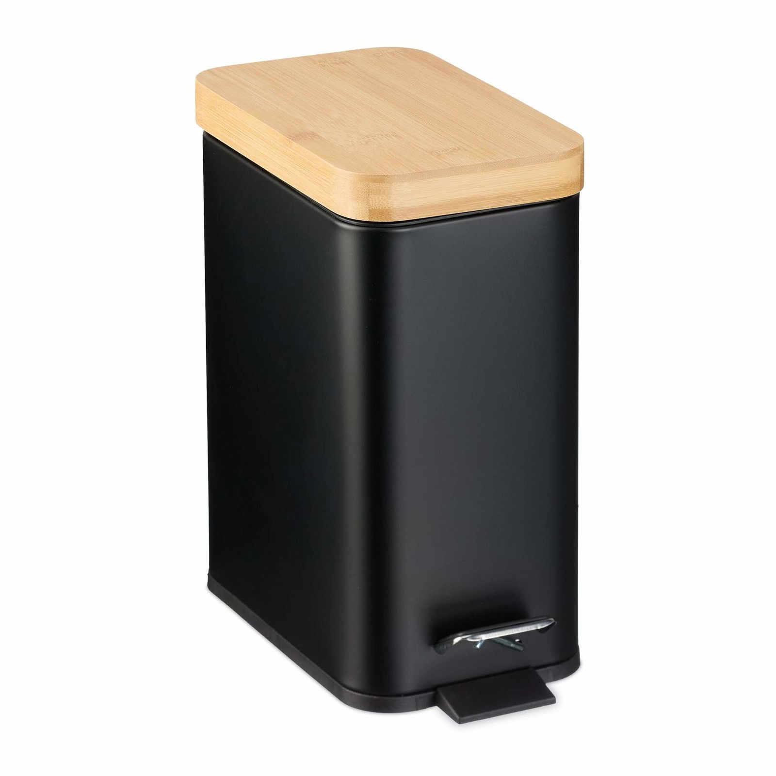Relaxdays Kosmetikabehållare, bambu svänglock, modern badrum soptunna, plast, 5,5 L, H x D: 26,5 x 18 cm, svart