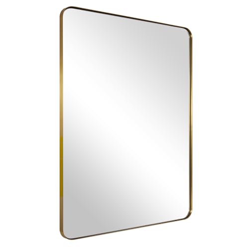 Guldväggspegel, 61 x 80 cm spegel för badrum, borstad mässing rostfritt stål metallram med rundade hörn, rektangel glaspanel väggmonterad spegel för dekor av badrum, sminkbord, tvättstuga