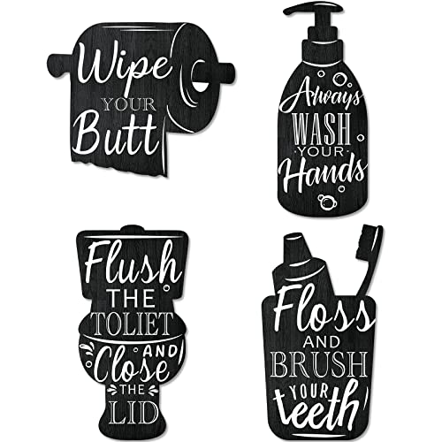4 st badrum trä väggskyltar tvättborste tandtråd spolning skylt väggdekor vintage badrum väggkonst hem badrum tvättstuga dekor, svart