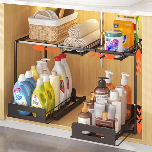 Shiyinge 2 våningar under diskbänken teleskop utdragbar korgstallation skåp diskbänksförvaring tvättställ hylla organisatör underskåp med låda korg för kök badrum stor svart