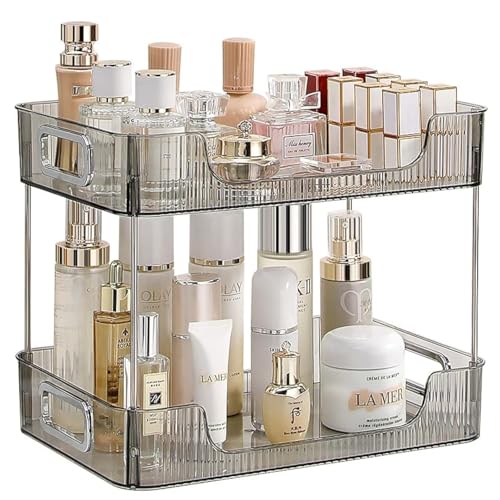 CESTATIVO Badrumsbänk organiserare, 2 nivåer sminkbricka, kosmetisk makeupförvaringshylla, badrum hudvård organisering bänkhylla, grå