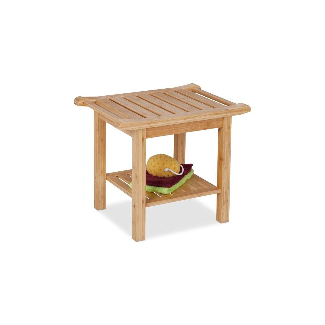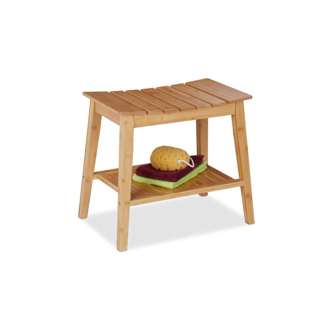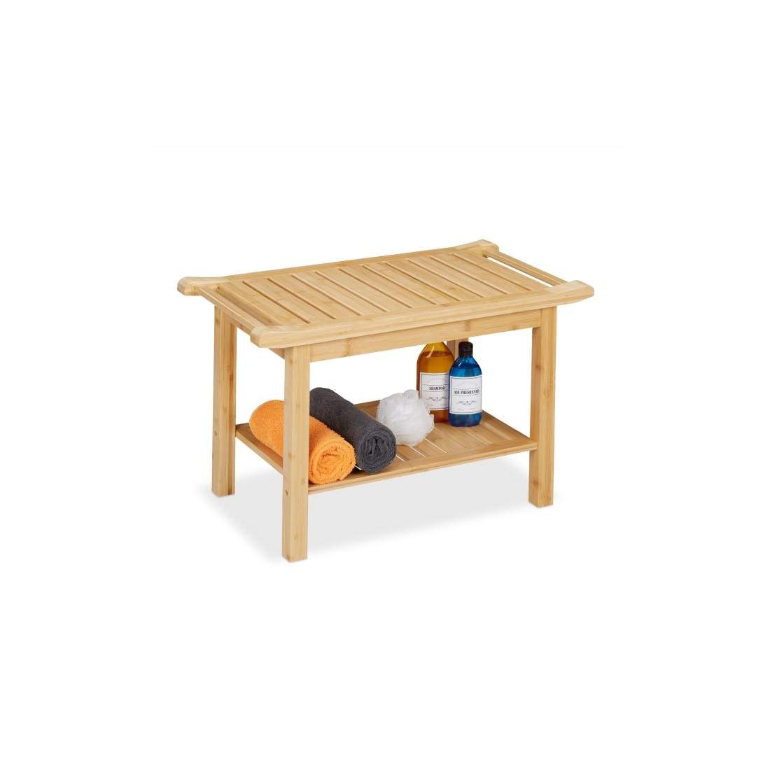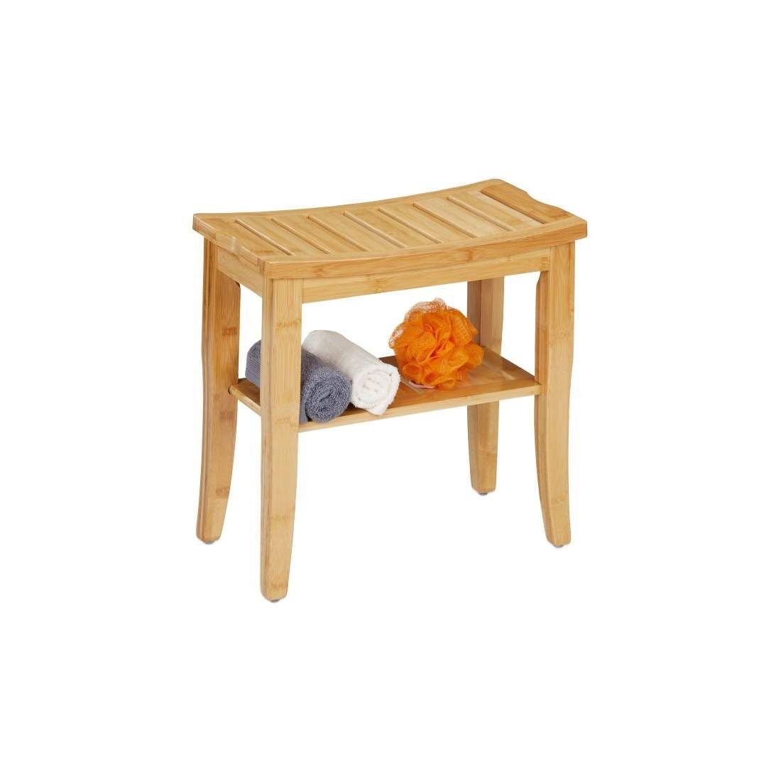 Relaxdays Badrumsbänk bambu, sittbänk badrum, hylla badrumspall trä, H x B x D: 45 x 66 x 40 cm, badrumsmöbler, natur