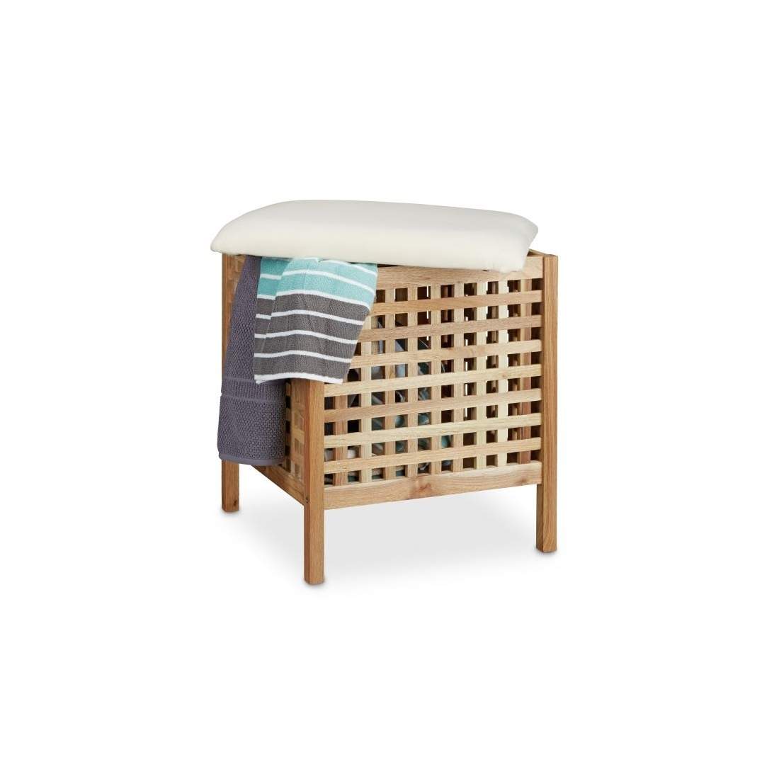 Relaxdays Tvättkorg med säte, badrumspall med förvaringsutrymme, 40 l tvättkorg, trä/tyg, HBT: 51 x 41 x 41 cm, natur/vit