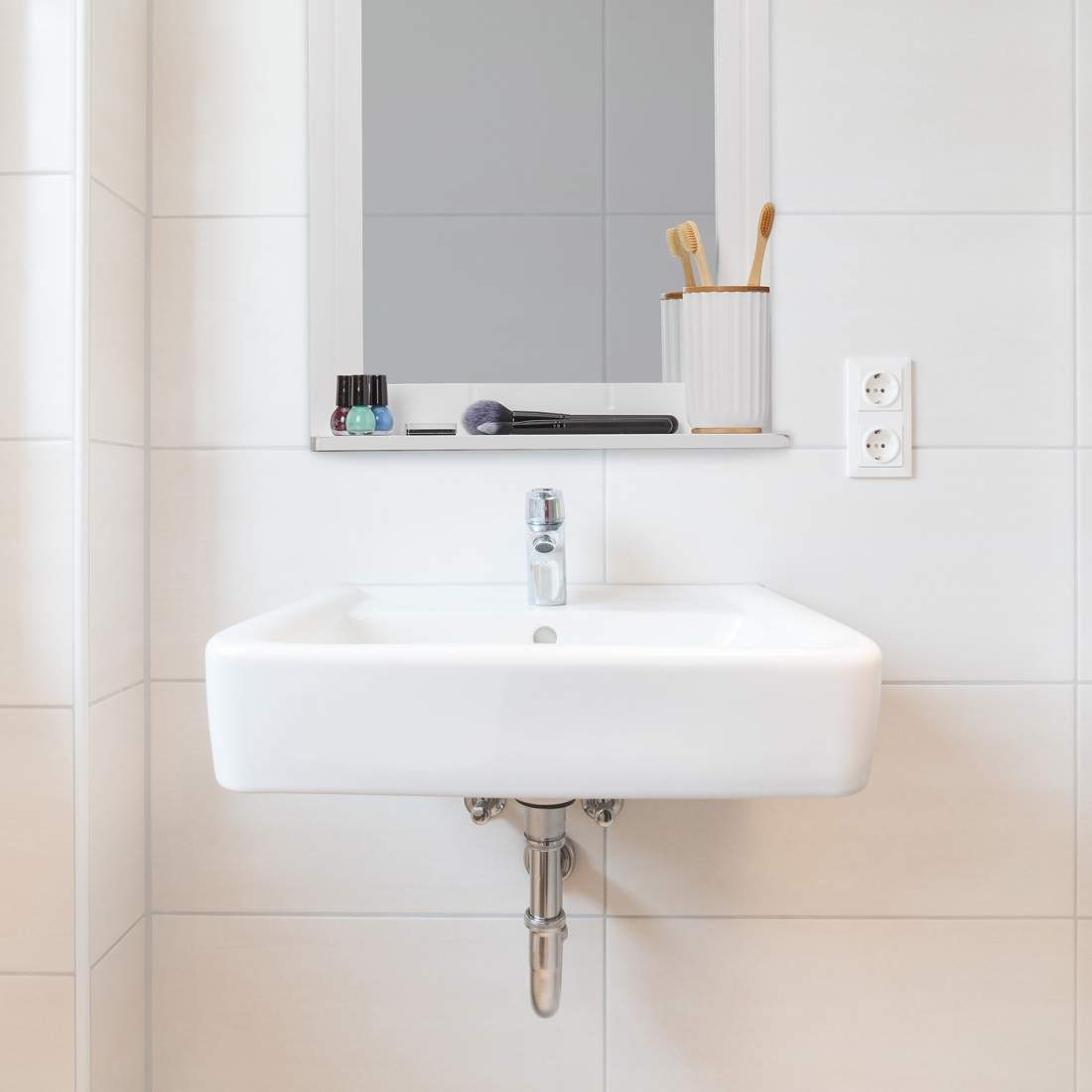 Vit badrumsspegel med hylla – modern förvaringslösning