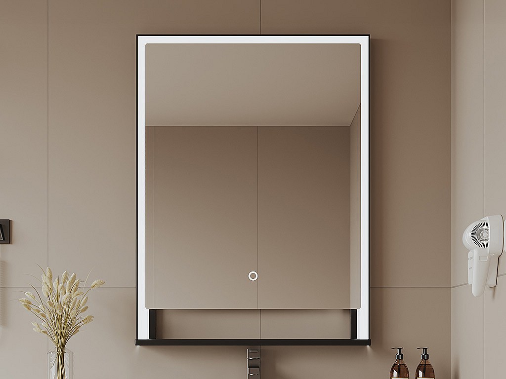 Rektangulär badrumsspegel med belysning, imfri funktion och integrerad hylla - Matt svart ram - 60 x 80 cm - VALONERA