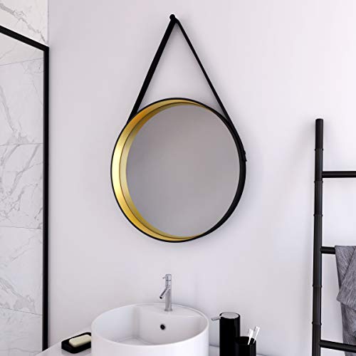Talos Golden Style väggspegel Ø 50 cm – rund badrumsspegel i guld med läderutseende – högkvalitativ aluminiumram, mångsidig, kan även hängas utan rem.