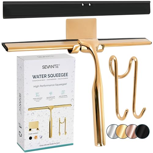 SEVANTE Duschskrapa 24,5 cm – metallfönsterskrapa – badrumstillbehör – avdragare dusch med hållare – spår för dusch, glas och spegel – duschkabinsavdragare – guld