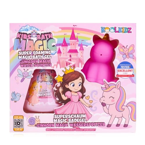 Accentra bad kul set KOOLKIDZ för barn, 60 ml badset med skumande badgel i presentförpackning, vattensprutleksak enhörning, söt jordgubbsdoft, prinsessa och enhörning, present till födelsedag