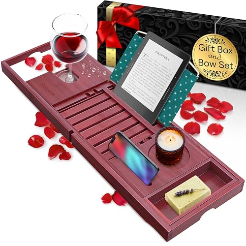 SereneLife Bambu badkar caddie med lyxig presentask och rött presentband, utdragbar och justerbar bricka med enhet/bokhållare med avtagbara brickor för badtillbehör (naturlig)