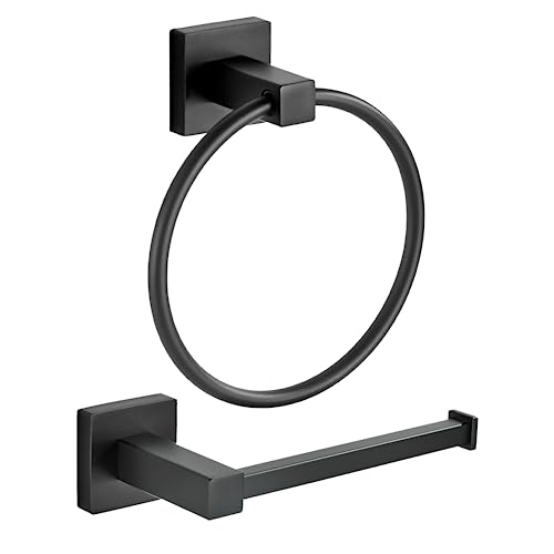 FORBATH Svart toalettpappershållare, badrum handdukshållare fyrkantig 2 delar set matt svart toalettpappershållare handduksring rostfritt stål badtillbehör väggmonterad