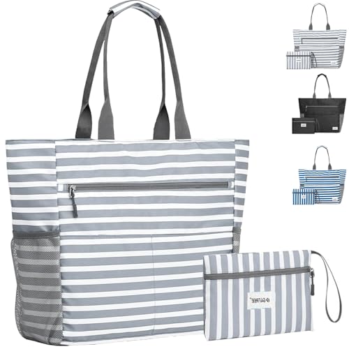 oscaurt Strandväska, randig, bärväska, badväska, vattentät, strandväska, stor med dragkedja, shoppingväska, damer, strandväska, XXL, familj, shoppingväska, axelväska, univäska, resväska, LJUSGRÅ,