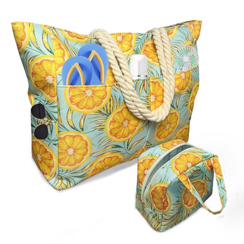 Stor badväska med 7 fickor, 1 kylväska, 50 l orange strandväska xxl familj med dragkedja, poolväska, vikbar, sandtät, simväska dam för shopping, strandsemester, picknick