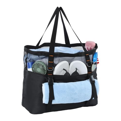 RAINSMORE Strandväska XXL familj med dragkedja badväska damer stor lätt nätstrand väska vattentät vikbara axelväskor för strand resa picknick, svart, XX-L, Western