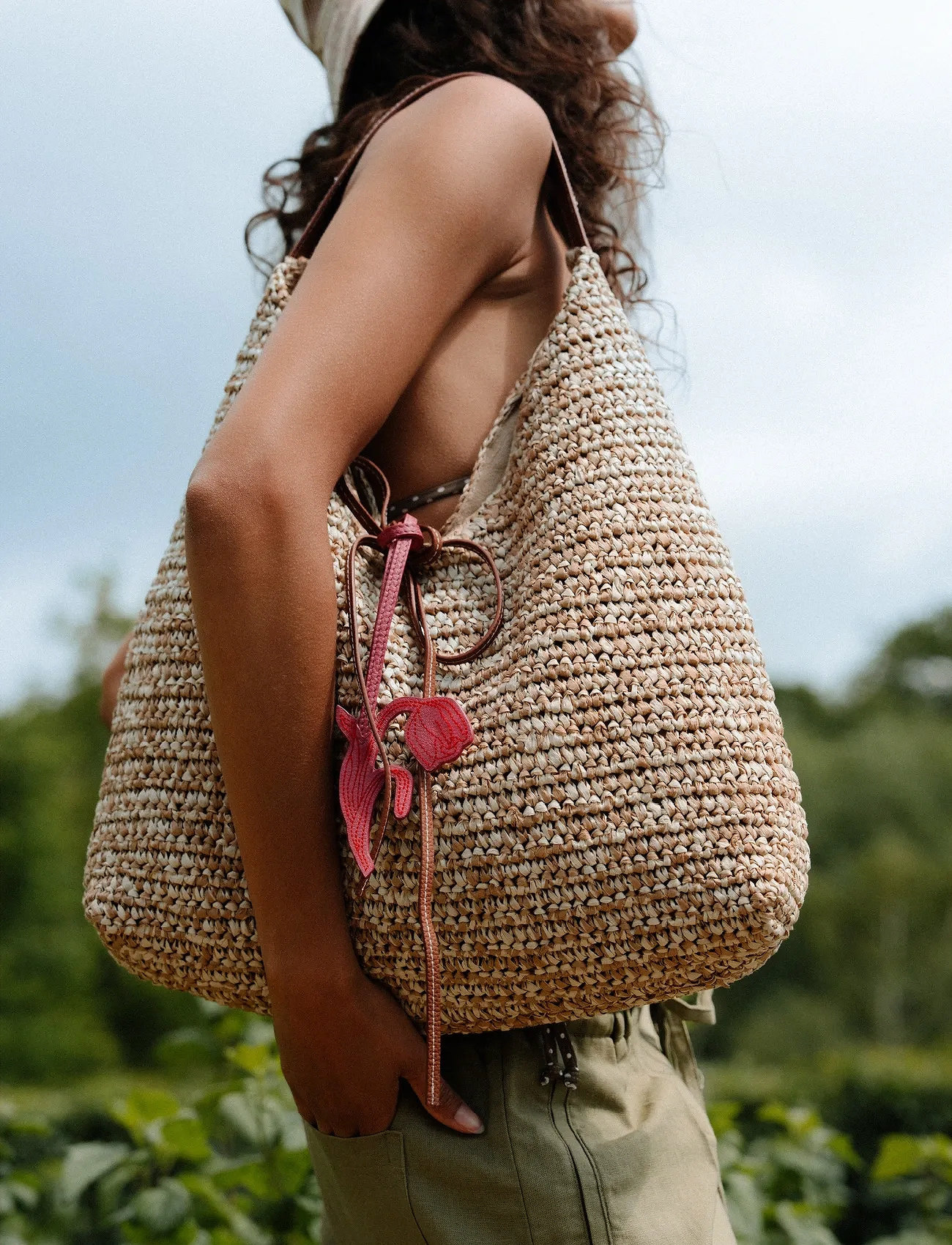 Mango Natural Fibre Shoulder Bag With Flower Charm - Brown - ONE SIZE
