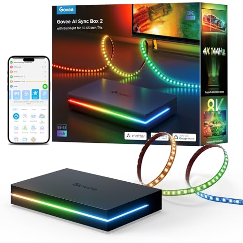 Govee HDMI 2.1 Sync Box Kit 2, inkl. TV-bakgrundsbelysning, AI Sync Box, stödjande 8K@60Hz, 4K@144Hz, VRR och ALLM, funktionell med Matter, RGBIC LED-remsa för 55-65 Zoll Fernseher, 75 lysdioder/m