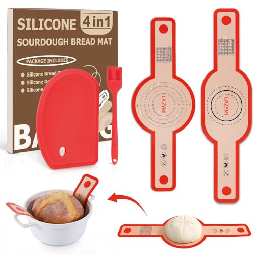 Lazymi 2 stycken bakmattor i silikon bröd för holländsk ugn, oval och rund silikonbrödslinga med långa handtag för brödgryta, brödbakmatta med degskrapa och bakborste, permanent bakmatta bröd, Röd
