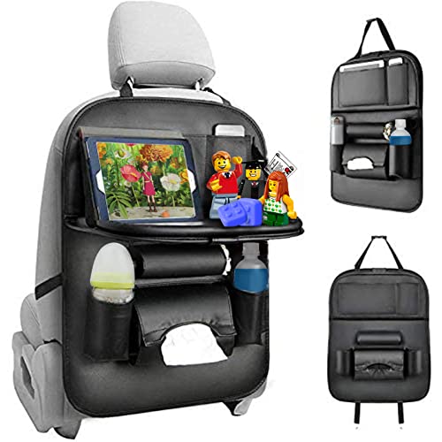 Ergocar Bilbaksätesorganiserare, sparkmattor, lyxigt PU-läder med vikbart surfplattehållare, bilorganisatörer, bilförvaring, multifunktionellt baksätesskydd för lång resa och familj (svart – 2-pack)