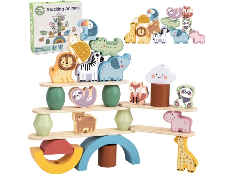WOOMAX - Trä djurtorn, Zookabee, inklusive kort och tygförvaringspåse, balansspel, safari, stapelbara, för spädbarn 24 månader, barnleksaker 2 år, pedagogiska spel, FSC (47568)
