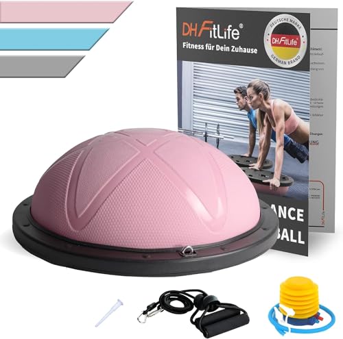 DH FitLife Balansboll, yoga balanstränare, Φ60 x 22 cm, kan belastas upp till 200 kg, halv gymnastikboll, fitness balansbräda, balansbräda med pump och 2 träningsband, rosa