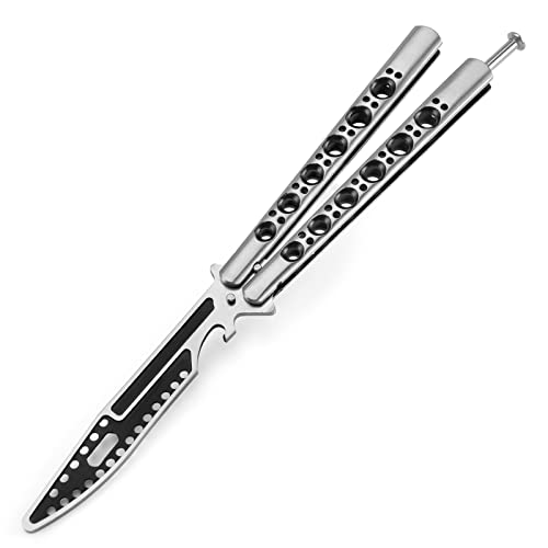 XBC Tech Träning fjärilskniv, Balisong 100 % rostfritt stål, oslipat blad praktisk hopfällbar fjärilsformare kamkniv (silver)