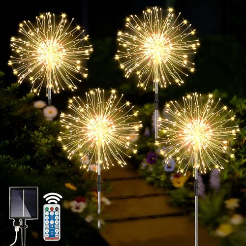 yowin Solcellsbelysning utomhus, 4 x 120 LED-lampor, juldekoration, 8 lägen, fyrverkerier, vattentät solcell, maskros, balkonglåda, varmvit