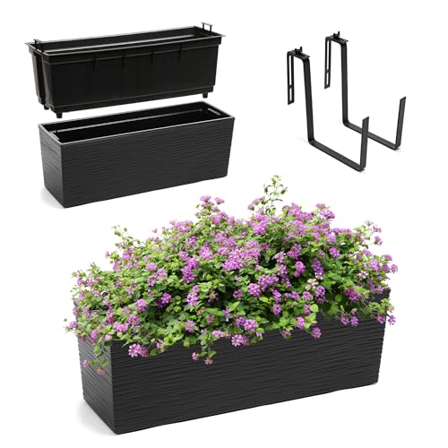 KADAX Blomlåda av plast, 18,5 x 56 cm, växtlåda med insats, väderbeständig balkonglåda, rektangulär blomkruka för utomhusbruk (med hållare, inristat mönster, svart)