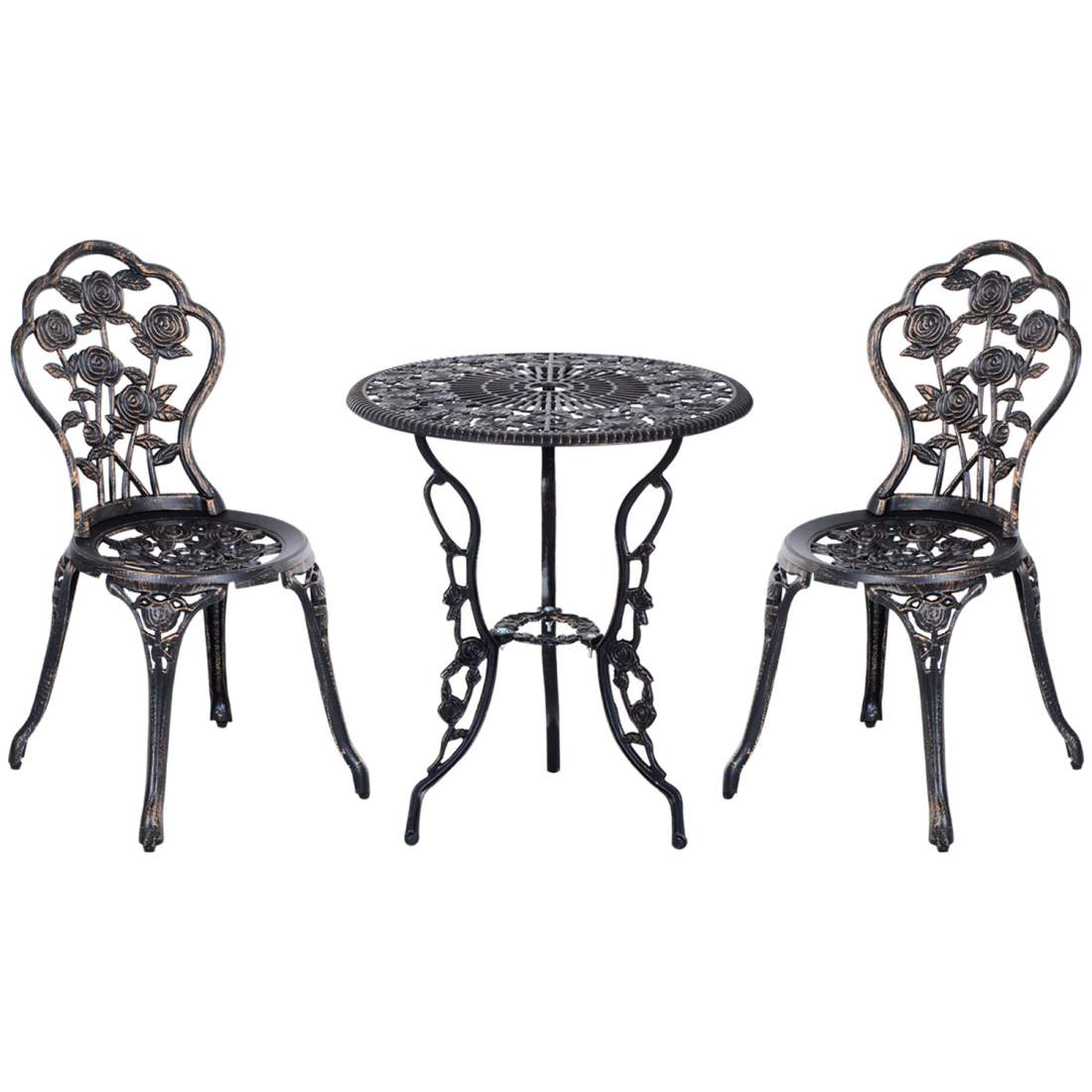 3-delad antik gjuten aluminium bistroset balkongset sittgrupp trädgårdsbord med 2 stolar svart