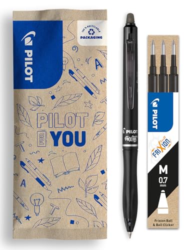 PILOT – Uppsättning av 1 FriXion Ball 07 Plus + 1 uppsättning med 3 påfyllningar – raderbar rullpenna – infällbar och påfyllningsbar – tillverkad av återvunnen plast – svart – medium spets