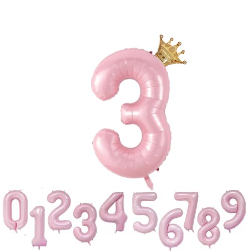 VUCDXOP Ballong siffror 3 med krona, rosa, 101 cm, heliumballong, flicka, födelsedag, ballong, dekoration, bröllop, jubileum, fest, dekoration – flyger med helium