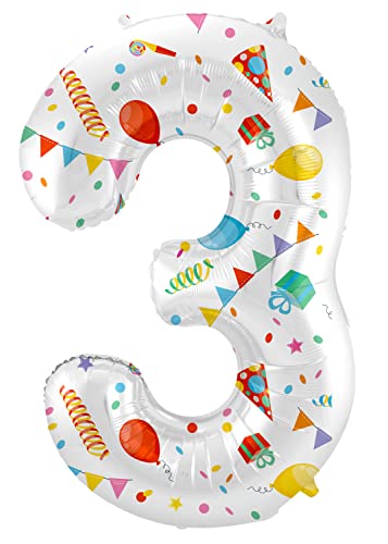 Folat 64173 ballong födelsedag siffra 3 glad fest vit med gåvor och dekoration 86 cm heliumdekoration födelsedagsdekoration, ballong nummer, färgglad